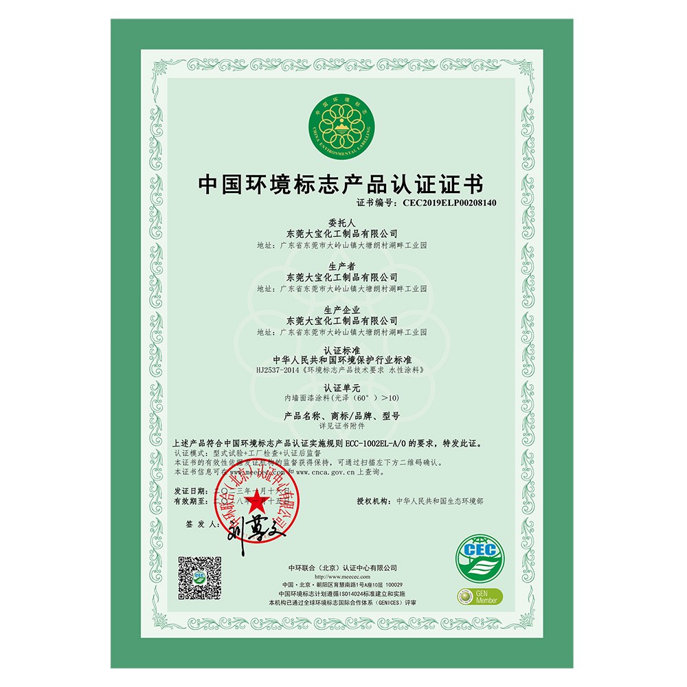 中國環(huán)境標志產(chǎn)品認證證書(乳膠漆)