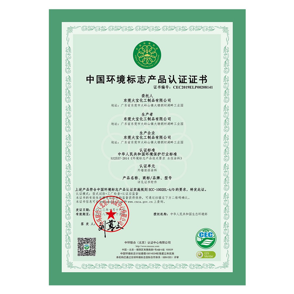 中國環(huán)境標志產(chǎn)品認證證書(外墻涂料)