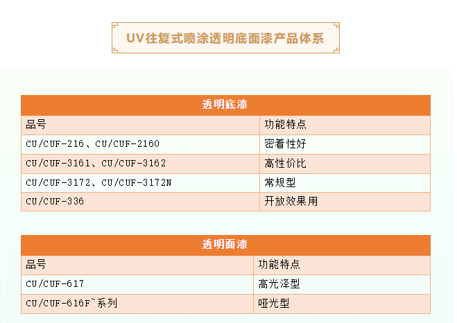 素材→UV往復式噴涂開放底漆(50-60g/㎡)→UV固化→輕砂→UV往復式噴涂透明底漆(60-80g/㎡)→UV固化→砂光→UV往復式噴涂透明面漆(60-80g/㎡)→UV固化