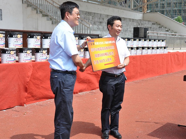 2013年6月28日上午,一場傳遞正能量的捐贈活動在四川省雅安市蘆山中學的操場上舉行,東莞大寶化工制品有限公司向蘆山地震災區的教育系統捐贈了5000桶環保油漆,總價值160萬元。陳春華總經理、葉子琛執行經理等領導出席儀式,蘆山縣教育局局長朱文華作為代表接受捐贈。