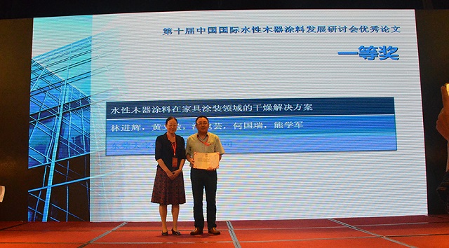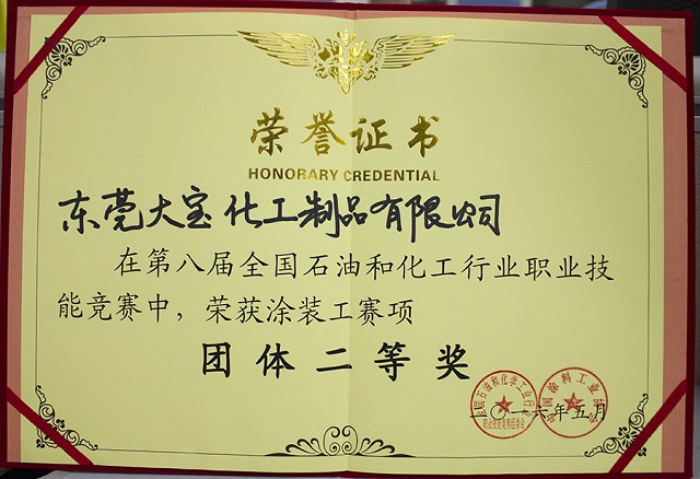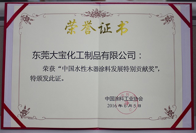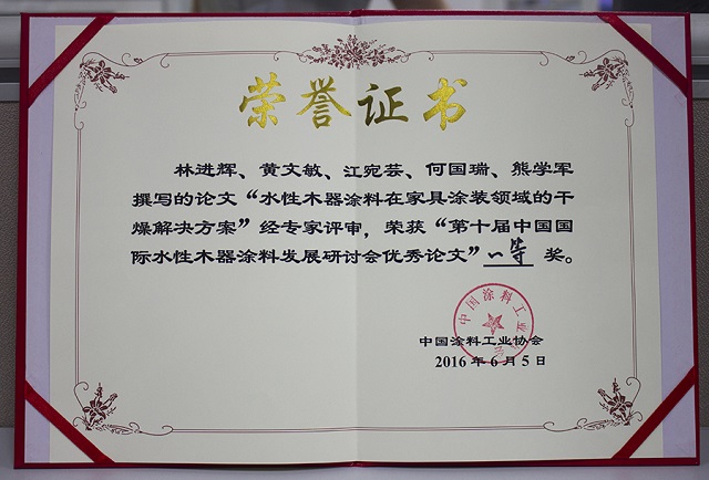 會(huì)議上表彰了一批十年來在推動(dòng)中國(guó)水性木器涂料產(chǎn)業(yè)化進(jìn)程中做出特殊貢獻(xiàn)的企業(yè)和個(gè)人,大寶漆除了獲得“中國(guó)水性木器涂料發(fā)展特別貢獻(xiàn)獎(jiǎng)”外,由大寶化工技術(shù)部林進(jìn)輝等人撰寫的《水性木器涂料在家具涂裝領(lǐng)域的干燥解決方案》和《自交聯(lián)丙烯酸酯乳液在水性木器封閉底漆中的應(yīng)用研究》還分別榮獲本次論文評(píng)選一等獎(jiǎng)和優(yōu)秀獎(jiǎng),大寶漆還奪得了“全國(guó)水性涂裝職業(yè)技能大賽團(tuán)體二等獎(jiǎng)”,而大寶化工工程師周光偉先生憑借多年水性涂裝經(jīng)驗(yàn)和精湛的技術(shù)榮獲“全國(guó)石油和化工行業(yè)技術(shù)能手”的榮譽(yù)稱號(hào)。
