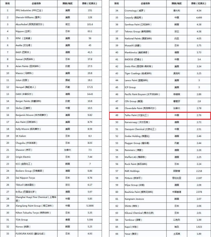 2020全球頂級涂料制造企業(yè)銷售額排行榜(前66名)
