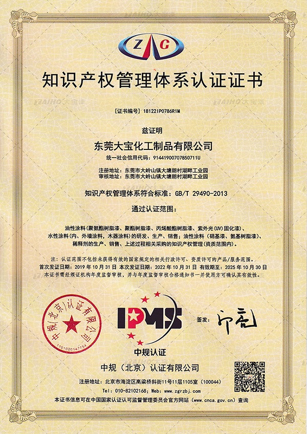 大寶漆不斷持續(xù)創(chuàng)新研發(fā),目前已經(jīng)獲得國(guó)家授權(quán)專利上百項(xiàng),申請(qǐng)已進(jìn)入國(guó)家知識(shí)產(chǎn)權(quán)局官審的發(fā)明專利57項(xiàng)、實(shí)用新型專利4項(xiàng)、外觀型專利2項(xiàng)。