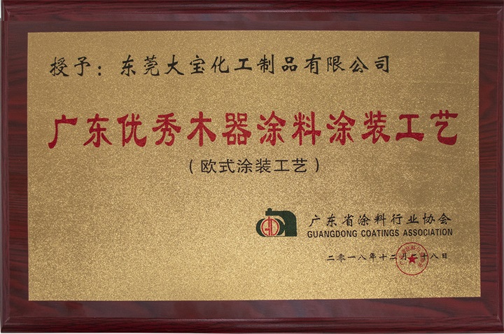 在2018廣東環(huán)保涂裝發(fā)展大會上,舉行了廣東省涂料行業(yè)協(xié)會“涂裝分會”成立儀式、2018廣東優(yōu)秀涂料涂裝項(xiàng)目表彰活動。憑借在綠色涂裝領(lǐng)域的優(yōu)勢和良好口碑,大寶漆被授予廣東省涂料行業(yè)協(xié)會涂裝分會“副理事長單位”。 在大會頒獎環(huán)節(jié),大寶漆歐式涂裝工藝還獲得“廣東省優(yōu)秀木器涂料涂裝工藝”榮譽(yù)。