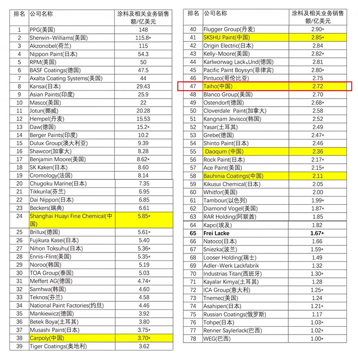 2018年全球頂級涂料制造企業(yè)銷售額排行榜(前78名)