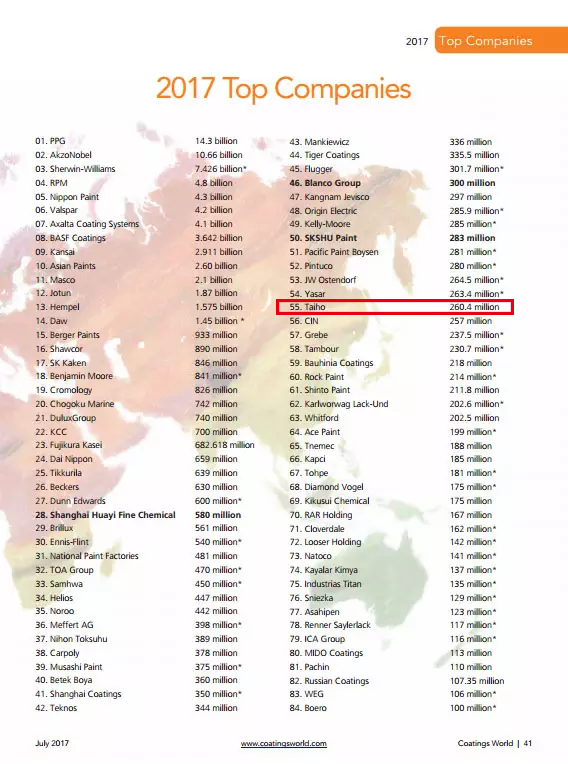 2017 Top Companies榜單公布,大寶漆排名全球第55名