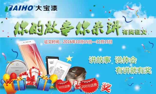 為更好地促進大寶漆各經銷商同仁間的交流與互助,讓經銷商同仁分享成功的經驗,通過分享市場第一線員工的成功案例及心得體驗,并以此作為學習楷模,取其智慧精華,促使各地經銷商同仁互補優(yōu)勢、共同提升,故大寶漆官方微信和大寶報聯(lián)合主辦“你的故事你來講”有獎征文活動。