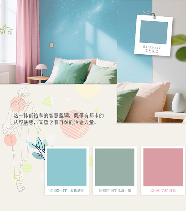 在春夏交替的時節,色彩是最快改變空間氛圍的利器。2025年度大寶推薦色B4322-64T藍色星空,靈感來源于捕捉了破曉時分的澄澈與日暮時分的溫柔。淺藍的輕盈中糅入一絲綠意,如同晨光微熹時的天幕,又似暮色四合前的遠山。